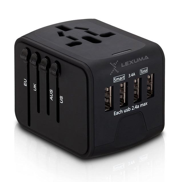 Universal Travel Adapter with 4 USB Ports for US EU UK AUS - All-in-One Charger with Smart Load Detection and Safety Certified