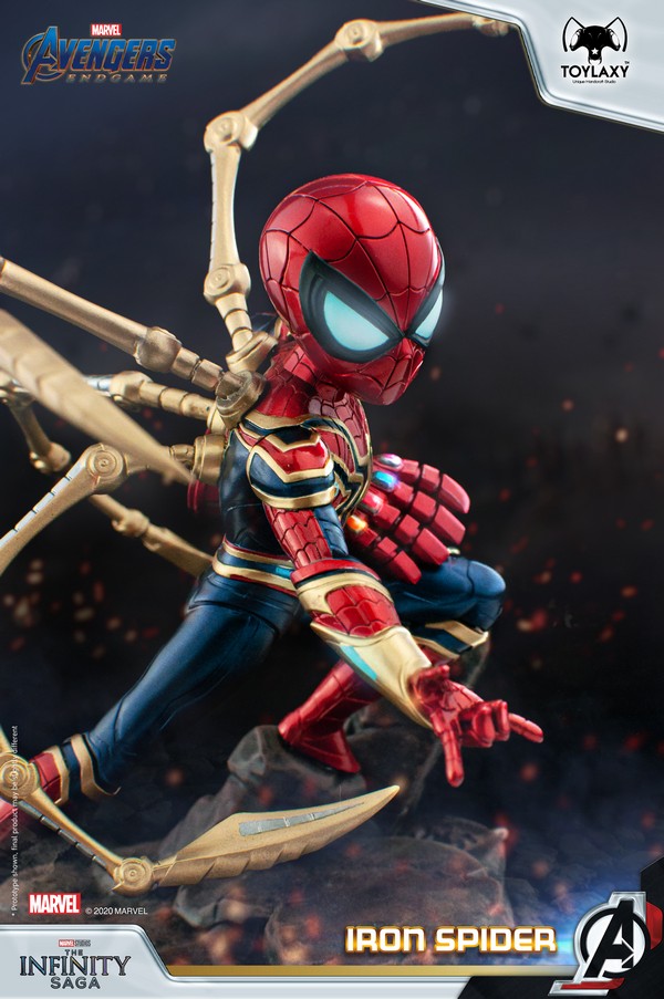 The startling actions of the Marvel character, the beautiful scene base, and the mini size all give the value of the Toylaxy Iron Spider figure collection. This Marvel figure is re-interpreted with the cartoon version of the Toylaxy figure on the premise that the original character of Iron Spider is retained. The unique design style and proportions surrounding Iron Spider show a refreshing look.