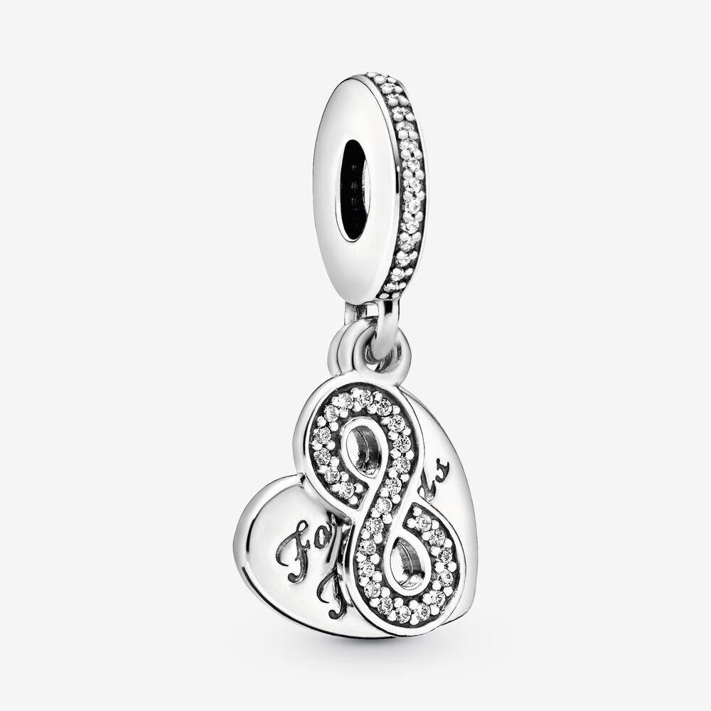 Wear or share this friendship charm to show that friends are forever – just like its engraving says. Cast from sterling silver, it's shaped into two dangles: a heart and a stone-studded infinity symbol for extra sparkle to the personal piece. It's made for our Pandora Moments charm bracelets, but looks equally cool as a necklace pendant.