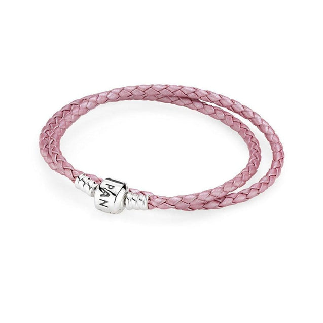 This pink double leather bracelet with sterling silver barrel clasp is a must-have to add to your collection. Add a few charms to make it yours!