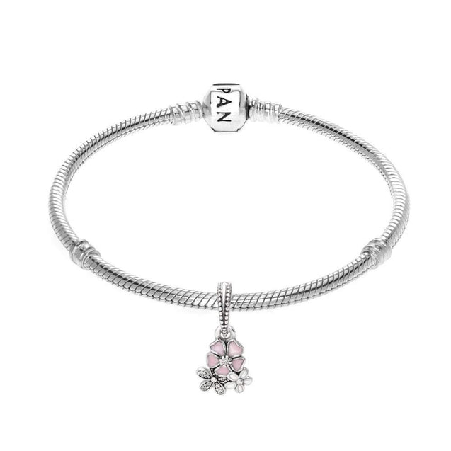 A charming, hand-finished floral dangle by PANDORA, featuring sweet sterling silver flowers decorated with pink and white enamel, and cubic zirconia stones.