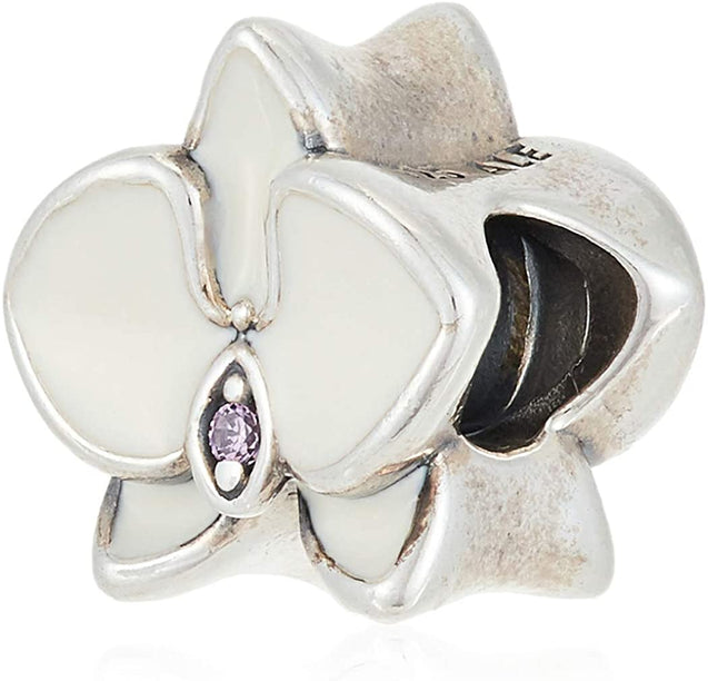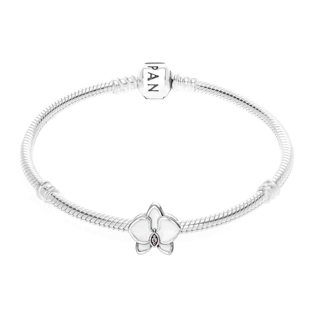 Pick exotic flowers for your bracelet, like this hand-finished orchid charm. Sterling silver, white enamel and soft pink stones are simply stunning.
