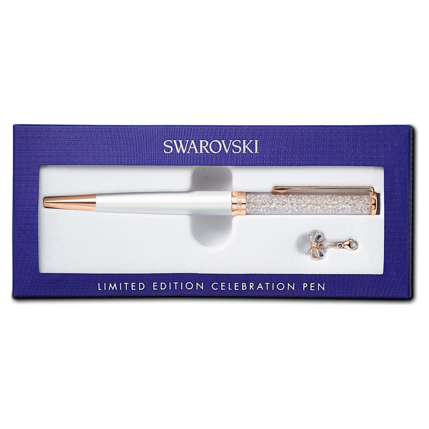 Celebrate 2021 in style with this Crystalline ballpoint pen by Swarovski. Its barrel is filled with hundreds of clear crystals, adding their brilliant sparkle to the beautiful white and rose-gold tone design. The top of the pen features the year '2021' to mark the occasion. A lifelong bow charm in crystal pavé attaches to the pen for a uniquely charming touch. The charm is removable and can be worn separately with other accessories or pieces of jewelry. A splendid gift for any special occasion.
