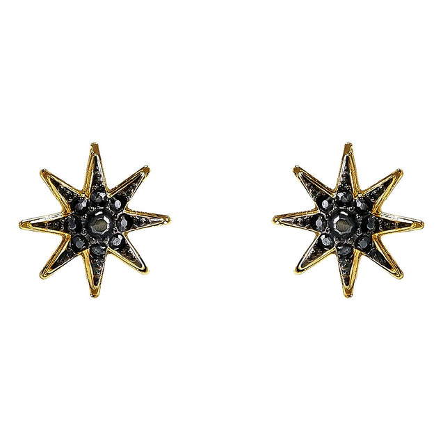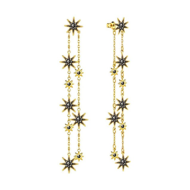 The luxurious combination of black and gold has never been more on-trend, and the Firework family is leading the charge this season. This versatile pair of pierced earring jackets features fluid chain detailing and small black crystal pavé stars, crafted in gold and black ruthenium-plated metal. They can be worn as simple studs or as long earrings, by attaching the dangling chains. Embrace the new asymmetric earring trend by wearing a stud in one ear and the long dangling version in the other ear.