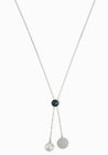 A chic, modern design with a customizable twist. This palladium-plated necklace features galactic spheres with blue crystal pavé and Crystal Pearls. A unique sliding mechanism allows you to play with the position of the dangling crystals and create different looks.