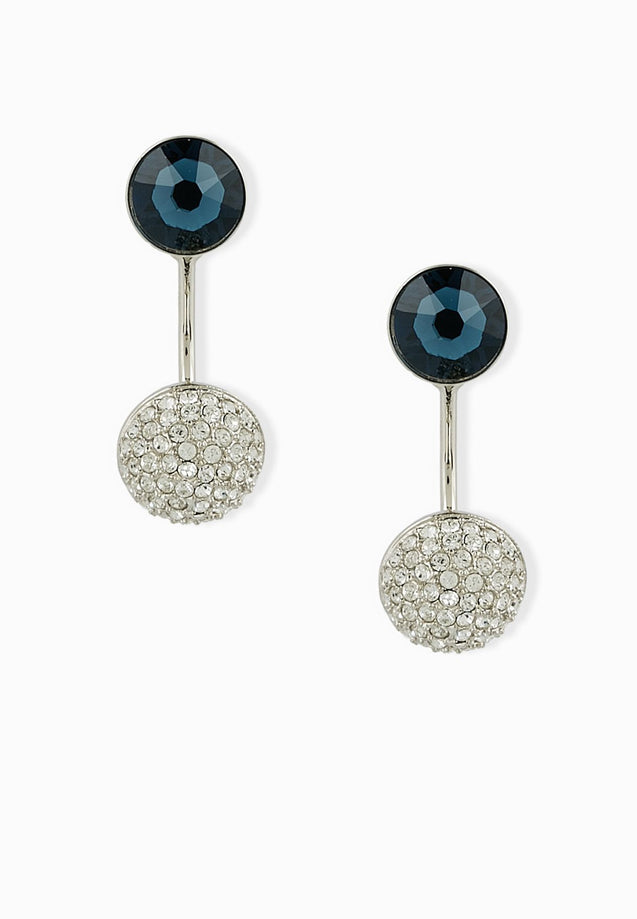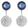 A pair of Swarovski pierced blue crystal stud earrings crafted in rhodium-plated metal. These earrings include earring jackets featuring a clear crystal pave design.
