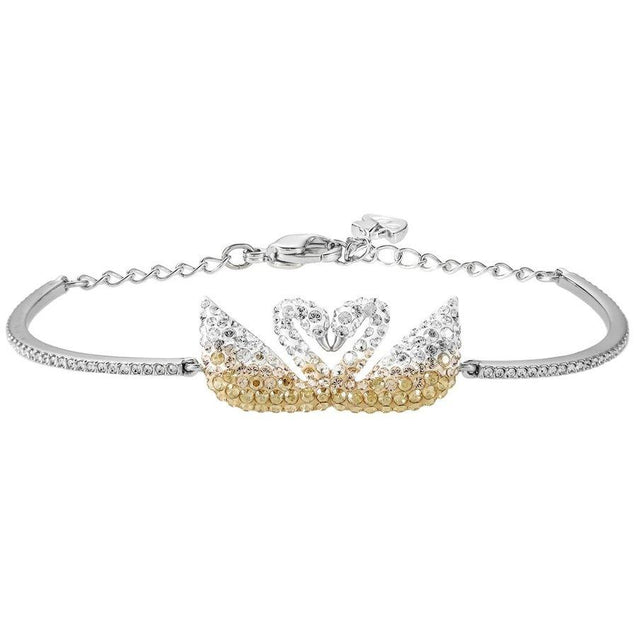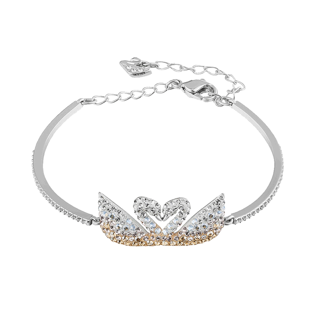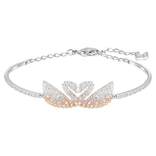 This refined bangle shows a pair of Swarovski’s Iconic Swan symbols, embellished with a gradation of crystal colors in our exclusive Pointiage® technique. A must-have for any jewelry box, it combines easily with other jewelry pieces and is finished with an adjustable chain closure.