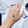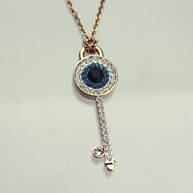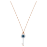 A key-shaped silhouette bestows a modern twist on the classic evil eye pendant. Luxuriously crafted in rose gold-plated metal, it shines with blue and clear pavé, and a black ‘pupil’ centerpiece. Cool and romantic, it would pair well with the matching earrings and ring for a truly bohemian aesthetic.