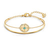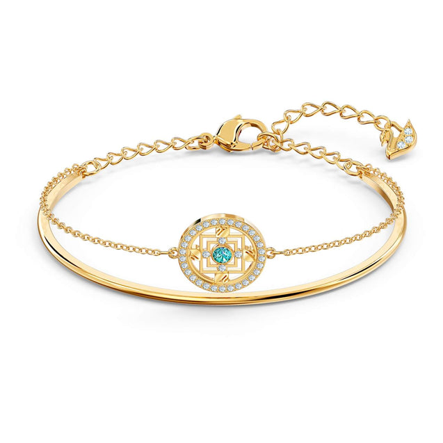 This elegant Swarovski bangle is as charming as it is beautiful. It features a stunning, gold-tone plated mandala as its centerpiece. The single, turquoise Swarovski crystal adds a touch of color to the gold-tone plated bracelet. A charming and creative addition to your jewelry collection.