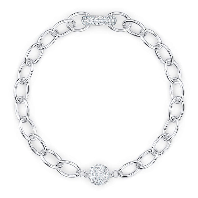 This soft bracelet by Swarovski is a fashionable must-have that exemplifies simplistic style. The sleek lines of its chain design are artfully interrupted by a single, larger chain link glittering in clear crystal pavé. The soft bracelet closes with a magnetic closure adorned with additional shimmering crystals. Create numerous different styles by combining it with bracelets with matching closures. A splendid gift giving idea.